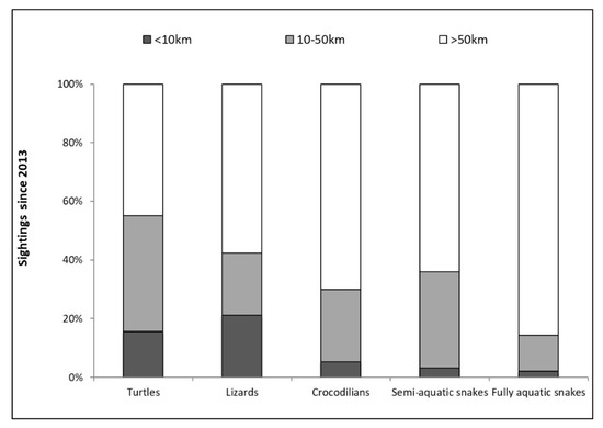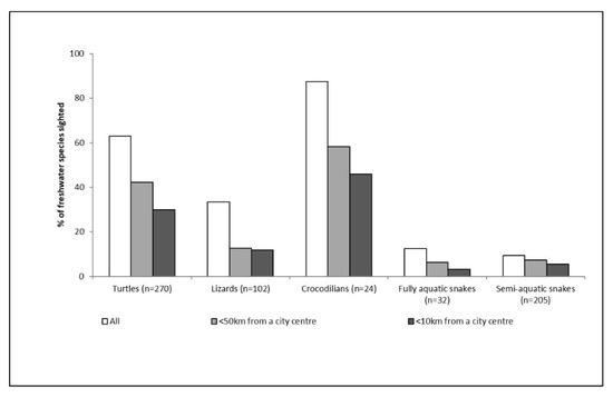 Freshwater reptile species sightings from GBIF (2013–2018) in each major group by the distance the center of a city. No shading represents the percentage sightings made at more than 50 km from a city center.