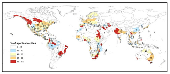 Global geographic patterns of persistence of freshwater reptiles in and around cities could help identify the factors that help or hinder persistence in a given city or region. Global patterns of species richness and endemism of freshwater reptiles had been assessed under Freshwater Animal Diversity Assessment (FADA) at the level of the eight zoogeographical regions of the world [7]. This assessment showed that the Oriental and Neotropical zoogeographical regions each had greater species richness of freshwater lizards [9], crocodilians [10], freshwater snakes [11] and freshwater turtles [12] than any of the other six zoogeographical regions of the world. In contrast, the GBIF data we used here showed FEOW regions in North America (Nearctic zoogeographic region) as having much higher species richness than the rest of the world (Figure 9, Table S3). Those data also showed many FEOW regions in South America (Neotropical zoogeographical region) and South- East Asia (Oriental zoogeographic region) as having much lower species richness than Western and Central Europe and Eastern Australia (Figure 9, Table S3). The strong relationship between the number of sighting records in a region and species (Figure 2) suggests that there were probably too few sightings from a great majority of FEOW regions to adequately represent species richness in those regions. Hence, the five-year species sighting records from GBIF are unlikely to have accurately captured global patterns in the persistence of freshwater reptiles in cities.