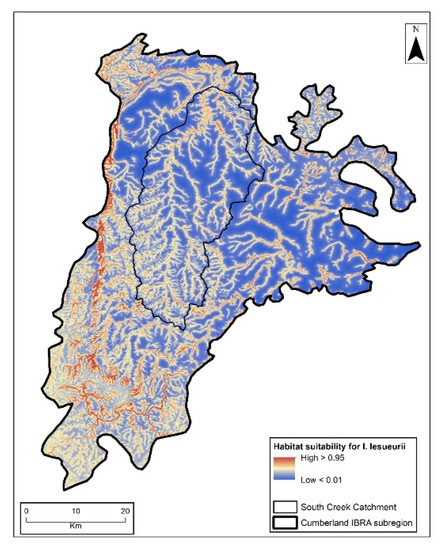 The predicted habitat suitability for I. lesueurii declined sharply with distance from the drainage line in lower (northern) parts of the region (Figure 10). River reaches with continuous highly suitable habitats for I. lesueurii were outside of the South Creek catchment to the west along the Hawkesbury River bordering large protected areas (Figure 1 and Figure 10).