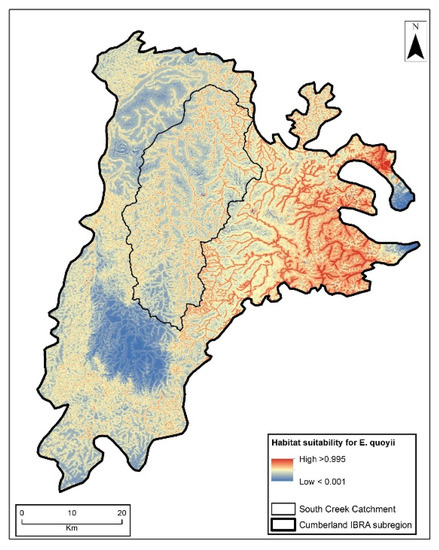 For E. quoyii there was little contrast in habitat suitability between drainage lines and other areas (Figure 12). Hence, most of the entire South Creek catchment was predicted to have to moderately suitable habitat for E. quoyii (Figure 12). This was in sharp contrast to both I. lesueurii (Figure 10) and C. Longicollis (Figure 11). For both these species, parts of the South Creek catchment were not predicted to have any suitable habitat.