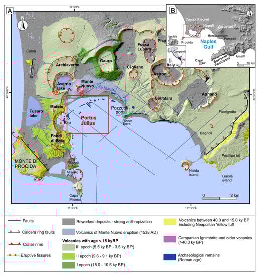 The volcanic activity following the NYT eruption was characterized by about 72 explosive and effusive eruptions, recognized in stratigraphic records over an area of about 1000 km2 [61]. These eruptions, both explosive and effusive, have produced lava flows and pyroclastic deposits and they occurred in three epochs of volcanic activity, between 15 and 10.6 ka BP, between 9.6 and 9.1 ka BP, and between 5.5 and 3.5 ka BP [62]. After a quiescence of about 3000 years, the last volcanic event has deeply modified the morphology of the area with the formation of the Monte Nuovo tuff cone in 1538 CE [21,28,63,64].