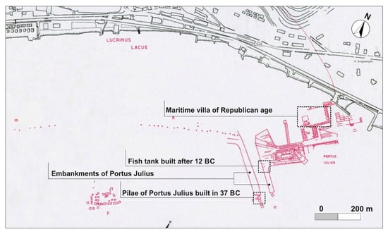 However, the use of the area for military purposes, related to the quick and victorious war against the pirate fleet of Sextus Pompeius, was very short and the harbour was converted in a commercial basin around the year 12 BCE, together with the relocation of the military port in the nearby Misenum, favoured by the presence of a natural triple-basin port and by a less problematic tendency to sand infilling. With the change of purposes, Portus Julius was rethought and restructured, with the transformation and the adaptation of military environments into warehouses and fish tanks, also along the entry channel to Lake Lucrino [37,38,39].