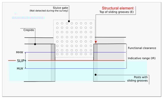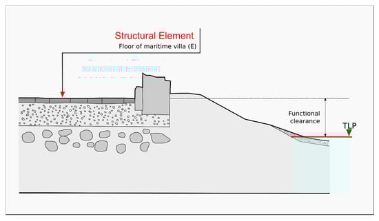 In the case of fish tanks, the indicative meaning and the related IR can be defined with high precision as reported in the ancient texts of Varro and Columella [71,72]. Thereby, while the functional clearance is considered a constant amount according to the archaeological interpretations, in the case of a fish tank, the IR varies between the mean high water (MHW) and the mean low water (MLW) (Figure 3).
