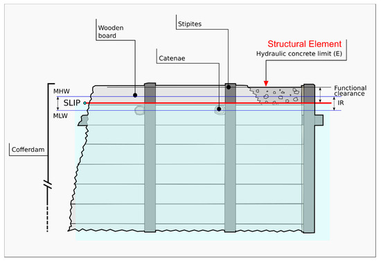 In fact, as described by Vitruvius [67], the cofferdams filled with hydraulic concrete had to emerge from the ancient mean sea level by an amount equal to a wooden board (about 0.50 m). Consequently, according to this archaeological interpretation, the elevation range over which the marker forms (IR) is directly related to the tidal range and varies between the mean high water (MHW) and the mean low water (MLW).