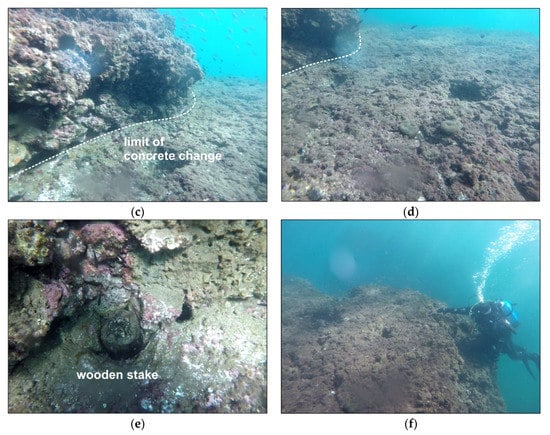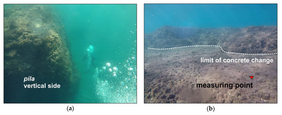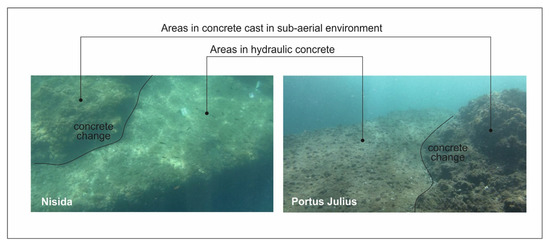 The divers recognized some areas where the hydraulic concrete was visible, thanks to its typical characteristics perfectly coincident with those described for the pila of Nisida by Mattei et al. [16]. These sectors detected on the upper face of the pila—where the subaerial concrete was totally eroded—appear as deeper areas with a flat and sub-horizontal morphology (Figure 5). These areas were always positioned underneath the areas in sub-aerial concrete that appeared very eroded with a rugged morphology (Figure 5).