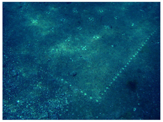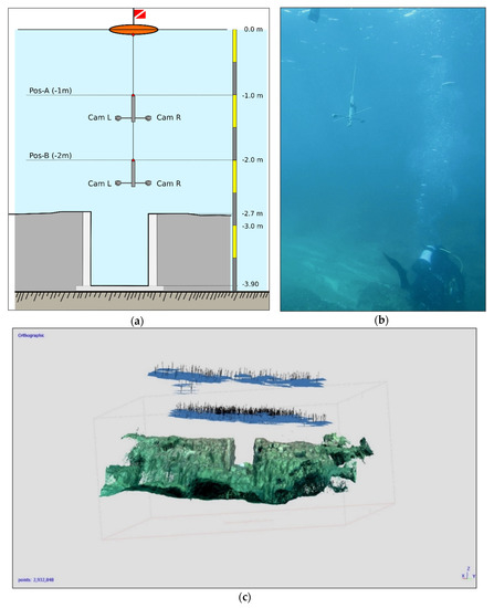 As shown in Figure 8a, the photographic system was towed by a rope connected to an emerged float and moved by divers. This system provides two basic positions, namely position A at −1 m and position B at −2 m below the sea surface.