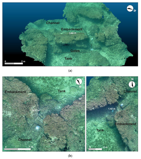 The fish tank here studied represented the key element of our geoarchaeological interpretations in terms of ground movements occurred during the Roman times, due to its strategic position. The sluice gate of this fish tank was built directly by cutting the channel embankment. This led to the assumption that it was therefore built in the second construction phase of the Portus Julius, according to Benini and Giacobelli [37]. Therefore, in this area, a high precision photogrammetric survey has been carried out both to obtain a detailed morphometric analysis of this functional element and to preserve a 3D documentation of this important and unique historical testimony, also considering the extreme fragility of this underwater landscape.