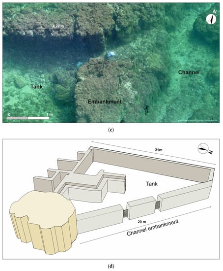 There are essentially three constructional elements directly linked to the sea level at the time of fish tank’s construction [73,75,76,77,78]: crepidines (a foot-walk border surrounding the tank and the internal pools); channel system (canals which allowed tidally controlled water exchange); cataractae (closing gates located at the access of the canal into the basin or at the communication passage between each tank).