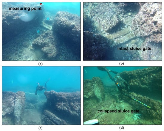 In this study, the submersion measurements concerned the Cataractae, considering that these structural elements were perfectly preserved in their original position. The measurements were carried out on top of the vertical posts cut by grooves, originally excavated in order to guide the vertical movement of the old gate, made of a sheet of lead or stone with several small holes (diameter between ~3 and ~9 centimetres, Figure 3).