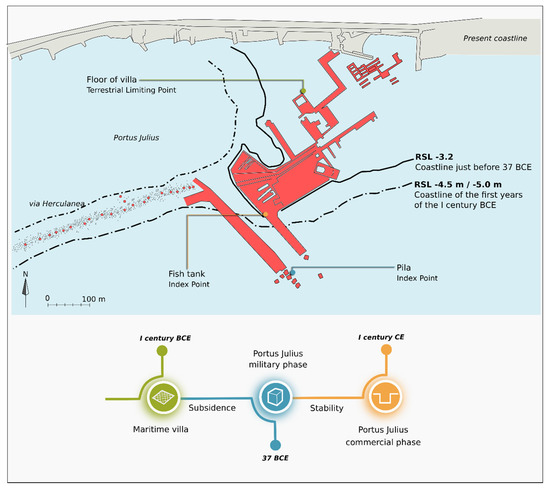 When better preserved and carefully investigated, the remains of those structures also reveal the evidence of relative sea level (RSL) changes that occurred during the Roman period. The typologies and dimensions of these remains may document the strong human capacity to modify the coastal physiography of the time, such as the opening of navigable channels to access the coastal lakes (see Lucrino and Averno lakes during the construction of the Portus Julius) or the artificial infill by which a 2 km long reach of Puteoli coast (ripa puteolana) was advanced tens of meters [30].