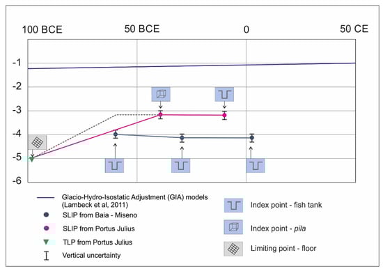 In this study, the pilae protecting the embankments of Portus Julius were used as SLIP (sensu Shennan et al. [70]) by detecting the concrete change (i.e., the limit between the areas in hydraulic concrete and the areas in concrete totally laid in a subaerial environment) (Figure 4) [16,88].