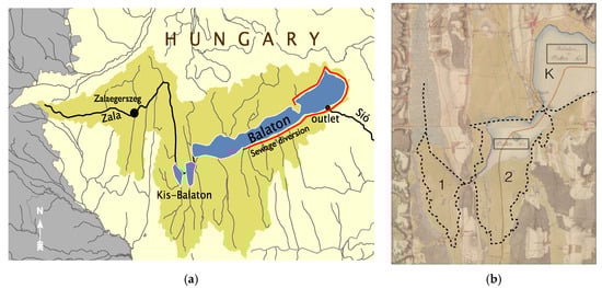 (a) Position of the Kis-Balaton wetlands within the Lake Balaton catchment. Zala is the largest tributary; Zalaegerszeg is the largest town upstream of Kis-Balaton. The red line indicates the sewage collector belt around Lake Balaton; (b) the western parts of Lake Balaton in the First Military Survey of Hungary (1782–1785, map slides with permission of Österreichischen Staatsarchiv) and the present outlines of the Kis-Balaton system. K: Keszthely Basin, presently the westernmost basin of Lake Balaton; 1 and 2: phases of the present Kis-Balaton system. “Lake Balaton” (in German, “Platten See” is written in the thin frames).