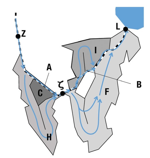 The present Kis-Balaton Water Protection System. Z: Zala River; H: Lake Hídvégi inundated in phase 1; C: emergency reservoir to enclose and treat pollution (e.g., oil spill) from Z; A: bypass of H; ζ: connector between phases 1 and 2 (a section of the Zala River); I: Ingói Reeds; F: Lake Fenéki inundated in phase 2, B: bypass of F; L: inflow into Lake Balaton. Black dots indicate major monitoring sites of inputs and outputs, blue arrows indicate alternative, adjustable pathways of flow.