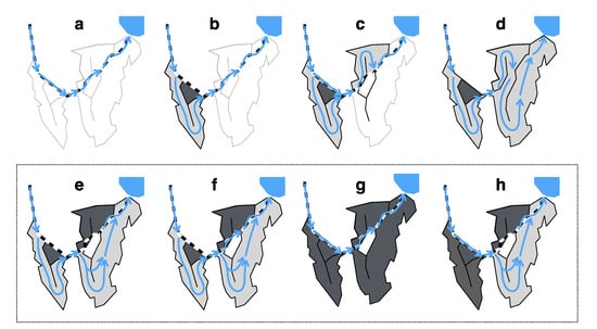 Historical (a–c), originally planned (d), and present (e–h) operational setups of the Kis-Balaton. (a): before 1985; (b): 1985–1992; (c): 1993–2013; (d): original plan of the complete system, (e–h): main flow routing options since 2014; (e) shows the normal way of operation. Dark shading indicates stagnant/bypassed water bodies, blue arrows show flow paths. Flow sequences using the codes from Figure 2 are as follows: in (a) ZAζBL, in (b) ZHζBL, in (c) ZHζIL, in (d) ZHζIFL, in (e) ZHζFL, in (f) ZHζ{2/B}L, in (g) ZAζBL, in (h) ZAζFL. The original plan of the Kis-Balaton was ZHζIFL. At present the following flow patterns are also possible: ZHζ{I/F}L, ZAζIL, ZAζ{I/2}L, ZAC, where curly brackets indicate parallel alternative pathways.