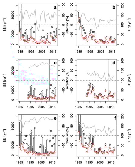 The behavior of the entire system was more stable than that of its components. SS retention was stabilized between 75% and 90% by the reliable performance of phase 2. Overall annual retention efficiency of TP has been usually low from 2000, but always in the positive domain (10–60%).