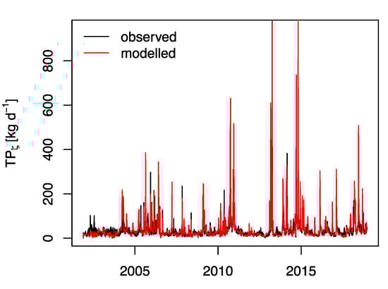 The simple dynamic mass balance model reasonably reproduced the observed daily TP flux at the outflow of Lake H (Figure 6). Optimal parameter values were vs = 0.002 m d−1, kr = 7.3·10−5 d−1, and kb = 1.2·10−8 d−1. These suggest that assuming a mean depth of 1 m, the half-life of TP would be 346 days in the water column. Moreover, the sediment stock practically never gets exhausted, and it can re-enter the water whenever conditions favor internal P load. These imply that the load reduction during the recent decade might increase the relative weight of internal load in the outflowing P flux. According to the model, negative retention (net release) of TP is likely to occur in months when the incoming P load is less than 2 t month−1.
