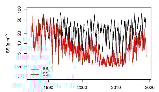 Yet another ineffective intervention was the bypass of Lake F. As mentioned above, revision of phase 2 was motivated by the catastrophic effects of inundating the Ingói Reeds with the algal-rich outflow of Lake H that included summer release of phosphate and die-back of the reed. After the redesign of phase 2, ecological objectives have become dominant in the operation of the entire Kis-Balaton. The objective of managing the Ingói Reeds were (i) to satisfy the ecological water demand, and (ii) to mimic the “natural” fluctuations of water level. Criteria for ecological water requirements have not been defined to govern flow routing. This has led to a paradoxical practice. In line with the two objectives, 13% to 21% of the annual flow at ζ was diverted to the Ingói with the exception of 2015, when the diversion was negligible (<2%). However, for unknown reasons the bypass weir was kept open in 2017 to 2019. As a consequence, the supplied water did not spread out in the Ingói Reeds but flowed through the old Zala River channel to bypass channel B. In contrast to management objective (ii), variance of daily water level decreased by a factor of 3.6 in the period 2014–2018 compared to 2005–2013. As a side-effect of the apparent water supply to the Ingói Reeds, elevated SS concentrations were observed at L, the vivid fluctuations of which were synchronous with the fluctuations at ζ (Figure 7). Although Lake F is a densely vegetated wetland system, the overall retention of SS decreased after its inundation because of the direct passage of a significant volume of water along bypass B.