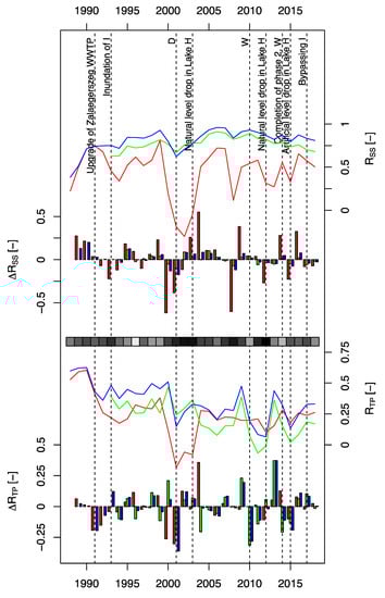Retentions of SS (RSS) and TP (RTP) and their annual changes (ΔRSS and ΔRTP, respectively). Red: Lake H, green: phase 2, blue: entire system. The grayscale ribbon indicates the relative magnitude of flow at Z, dark: minimal, light: maximal. “W” and “D” indicate extremely wet and dry years, respectively.