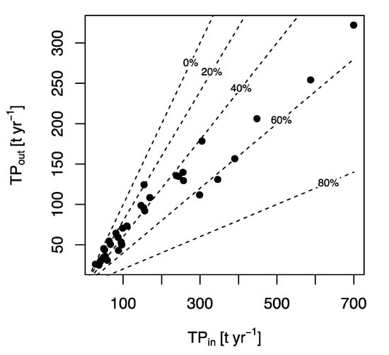 Outflowing flux of TP (TPout) as a function of inflowing TP flux (TPin) for the entire system. Isolines show constant retention rates.