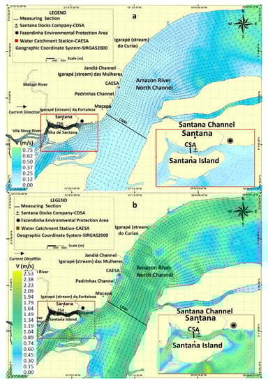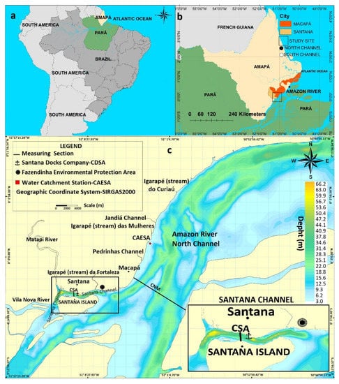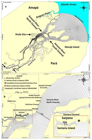 Santana channel and a significant stretch of the North Amazon River channel were the regions selected for the present study. Both regions are located close to Macapá City. These regions are of prominent ecological-environmental interest, since their challenges demand knowledge about the extremely complex hydrodynamics in these environments [10,13,22], which are influenced by high water discharges that depend on the meso-tidal phases [23].