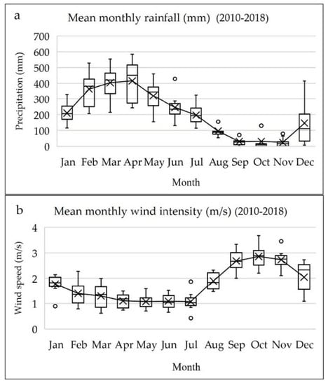 Similar to rainfall, variations in wind intensity are seasonal. Wind velocity is lower in the rainiest period and the opposite is observed in the lesser rainy period (higher intensity). Meteorological data in the current study (rainfall and wind intensity) are shown in the graphs depicted in Figure 2a,b, whose historical series was based on an 8-year time interval (2010–2018). Data were collected at Macapá’s meteorological station (MACAPA-AP-OMM: 82098), which is located close to Fazendinha Environmental Protection Area. Data were provided by the Meteorological Database for Education and Research (Banco de Dados Meteorológicos para Ensino e Pesquisa-BDMEP) of the National Institute of Meteorology of Brazil (Instituto Nacional de Meteorologia-INMET).