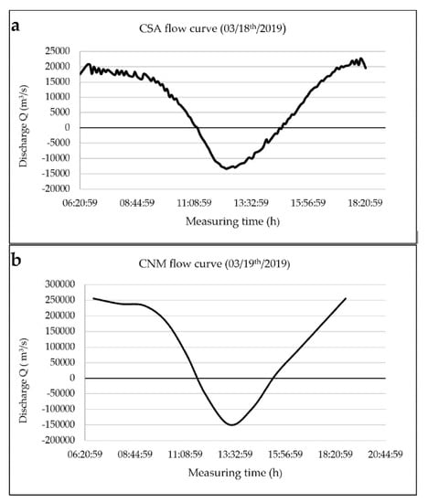 Figure 4a,b suggests that the behavior of the CSA and CNM flow curves is directly influenced by the tide coming from the Atlantic Ocean. The reversion period (flood) was significantly shorter in both channels between 3 h and 20 minutes and 3 h and 40 minutes than in the ebb outflow period, between 8 h and 20 minutes and 8 h and 40 minutes.