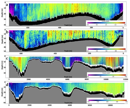 The two measurements selected for each one of the channels show details of the punctual velocity variation behavior and of the bathymetric profile in the measurement section conducted in the CSA and CNM, taking into account the ebb outflow and flood peaks. Data were extracted from the River Surveyor software and depicted in Figure 5a,b (CSA) and Figure 5c,d (CNM).
