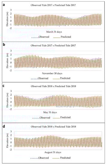 Results were forced to reference level (zero); the graphic comparison between predicted and observed tidal variations in the CDSA tide station are presented in Figure 6a–d (orange curves point out the model’s prediction and blue dots indicate observational data of the same period).