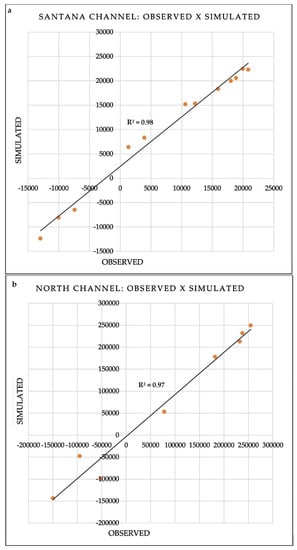 Correlation between simulated and experimental synchronize water discharge: (a) Santana Channel and (b) North-MacapáChannel.