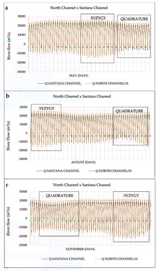 Results of field campaigns carried out in Santana (CSA) and North-Macapá (CNM) channels are represented by semidiurnal flow curves (Figure 4a,b). The maximum ebb and flood outflow values recorded for CSA in the field were of 22,729 m3/s and −13,381 m3/s, respectively. Once the climatic event that took place when the measurements were taken, some data captured by ADCP in the CNM were not properly continuously stored. Thus, it was necessary to interpolate the last measurement series. However, it was possible observing that the maximal outflow value was at the order of 254,944 m3/s; this value was −149,653 m3/s at flood (Figure 4b).