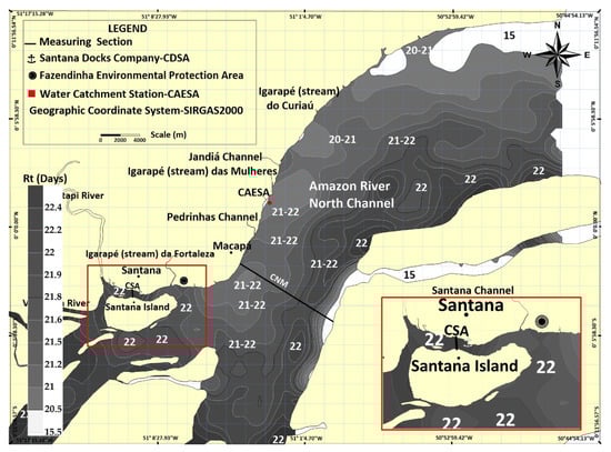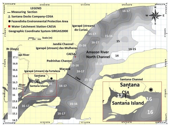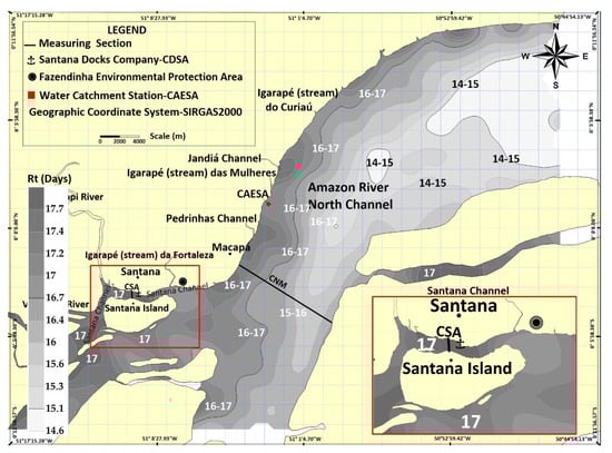 The North Channel (CNM) is located North Marajó Island (Coast of Amapá State) and Santana Channel (CSA) is close to Macapá and Santana cities (Figure 1). These two channels stand out in the current study; together, they hold approximately 40% of the total water flow in the lower Amazon River and transport great water masses into the ocean [21]. Moreover, they play an essential role in any Rt analysis applied to this estuarine sector.