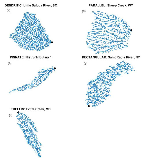 - Mejía, A.I.; Niemann, J.D. Identification and characterization of dendritic, parallel, pinnate, rectangular, and trellis networks based on deviations from planform self-similarity. J. Geophys. Res. 2008, 113, 1–21. [Google Scholar] [CrossRef]