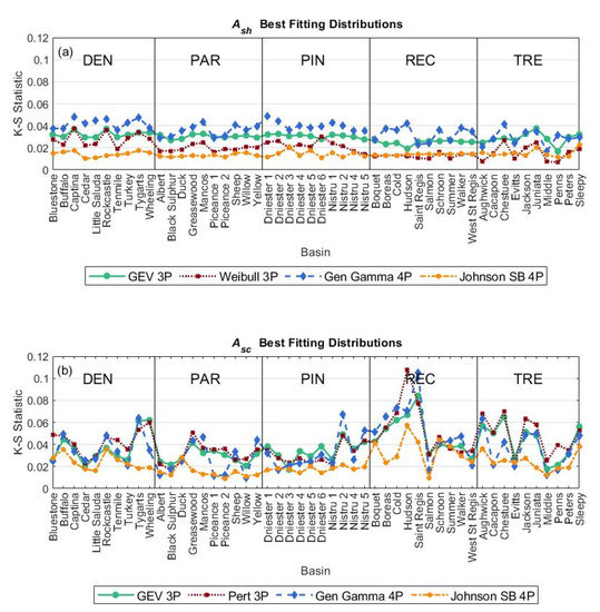 The K‒S statistics for the four best-fitting distributions for and are plotted for all basins in Figure 2. The four best-fitting distributions for are the generalized extreme value, three-parameter Weibull, four-parameter generalized gamma, and Johnson SB (Figure 2a). Overall, the Johnson SB distribution fits the observations of best with an average K‒S statistic of 0.014. Among the considered distributions, it also produces the lowest average K‒S statistic for each type except rectangular. Furthermore, the Johnson SB distribution produces the best AIC values for 31 of the 50 basins. The Weibull distribution produces the best AIC values for the remaining basins. Overall, these results suggest that the Johnson SB distribution is the best choice for representing and that the use of a four-parameter distribution is warranted.