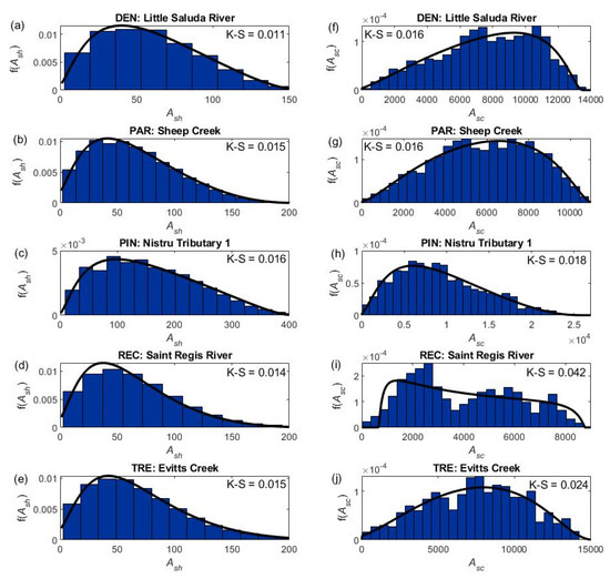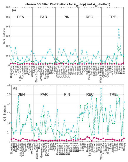 Before comparing the distributions of and between network types, it is necessary to examine whether the Johnson SB distribution is appropriate. Twenty-four theoretical distributions were identified as candidates to describe and based on their general properties (e.g., the existence of a lower bound). The parameters of each distribution were estimated for each basin using Easyfit version 5.6, which selects the parameter estimation method (method of moments, L-moments, maximum likelihood, or least squares) according to the distribution type. The fit of each distribution was then measured using the Kolmogorov‒Smirnov (K‒S) statistic, which is the maximum deviation between the sample cumulative distribution function (CDF) (i.e., determined directly from the DEMs) and the theoretical CDF [83,84]. The K‒S statistic is not compared to a critical value in a hypothesis test because the observations of and are not independent due to the nested structure of the drainage networks. Thus, they violate the assumptions required to perform such a test [83,85]. Because the candidate distributions have different numbers of parameters, the Akaike Information Criterion (AIC), as formulated by [86], was also used to assess the fit of each distribution while accounting for the number of parameters and possible overfitting.