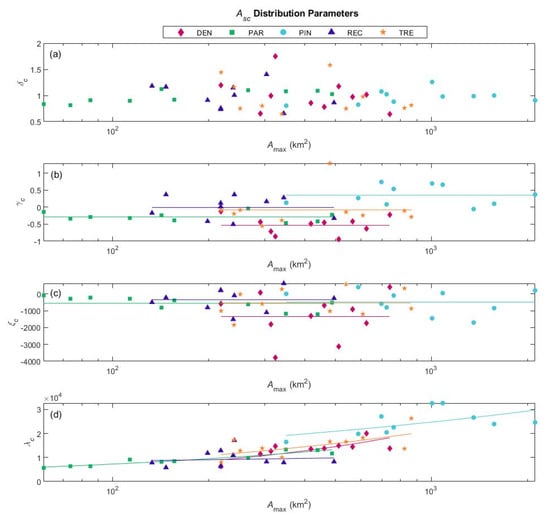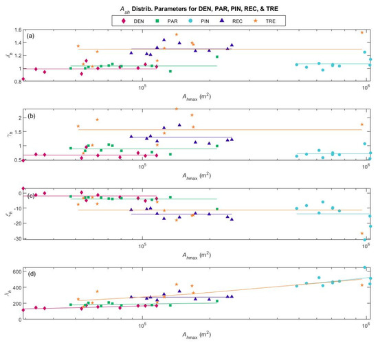 Parameters (a) , (b) , (c) , and (d) of the Johnson SB distribution for plotted against the maximum hillslope area . The symbols show the calibrated parameter values for each basin. The horizontal lines in (a–c) show the average parameter value for each network type. The lines in (d) show power functions fitted to the values for each network type.