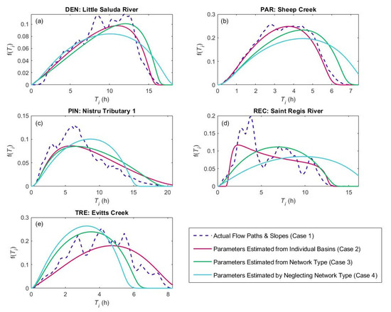 Four cases are used to compare the IUHs between network types and between different estimation methods. Case 1 explicitly considers the individual cell slopes and the actual flow paths for each basin (i.e., the travel times are based on Equations (3) and (8)). This method is equivalent to a pre-existing nonlinear SDTT method [41] and is considered the best estimate of the IUH for each basin. Case 2 replaces the individual cell slopes with (for hillslopes) and the slope‒area relationship (for channels), and it replaces the actual distributions of and with a theoretical distribution that is calibrated for each basin (i.e., the travel times are based on Equations (4) and (9)). The case continues to use the distribution parameters that were obtained from each individual basin. This case evaluates the assumptions that allow the network structure to be isolated in the variables and . Case 3 instead estimates the distribution parameters based on the network type. This is a synthetic UH method that uses the network type to infer the flow path configuration. Case 4 estimates the parameters of the theoretical distributions irrespective of the network type. This case is analogous to traditional synthetic UH methods that neglect consideration of an individual basin’s network structure.