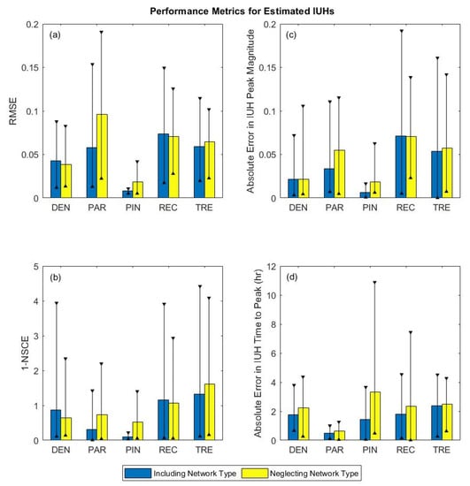 Four metrics are used to quantify the difference in performance between the network-type-based method (Case 3) and the case that neglects the type (Case 4) for all 50 basins (Figure 8). The first metric is the Root Mean Squared Error (RMSE) [91,92] where Case 1 is considered the observed IUH (Figure 8a). The second metric is the Nash‒Sutcliffe Coefficient of Efficiency (NSCE) [93]. Because larger NSCE values indicate better performance (in contrast with the other metrics), Figure 8b instead shows 1-NSCE so that lower values indicate better performance. The third metric is the absolute error in the IUH peak value (Figure 8c), and the fourth metric is the absolute error in the time of the IUH peak (Figure 8d).