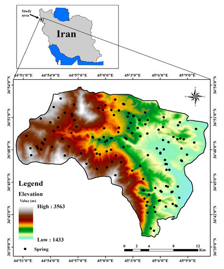 Map of the study area in north-western Iran, showing the 141 spring locations used in the present study.