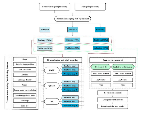 In this study, we used groundwater springs as good indications of groundwater availability for groundwater potential mapping. This is because in the study area, as in most other mountainous environments, few hydrogeological and hydrological data (i.e., groundwater levels, well yields, and stream discharge) are available due to a lack of piezometric wells in these high-elevation settings [35]. The methodology used in this research comprised several steps. First, the datasets were prepared for modeling. GARP, QUEST, and RF algorithms were then applied for mapping of groundwater potential. Next, the relative importance of conditioning factors was determined. Then, the area under the ROC curve (AUC), and true skill statistic (TSS) were applied for validation of algorithms in the novel application tested in this study. Finally, robustness analysis was applied to compare the capabilities of the three machine learning models (Figure 2).