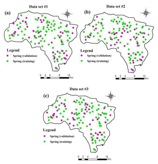 The occurrence locations of springs depict groundwater potential across the study area. Hence, a total of 141 spring occurrence locations in Piranshahr Watershed were determined by field surveys and using handheld GPS. For this modeling, the spring inventory locations were randomly divided into two groups, of 70% (99 spring locations) and 30% (42 spring locations), for training and validation steps, respectively. To clarify, the validation group was determined through randomization, and was not applied in model building. It is generally suggested in spatial modeling to apply approximately equal proportions of spring-present (1) and spring-absent (0) pixels [10]. Keeping this in mind, the 141 spring-present pixels and 141 randomly generated spring-absent pixels were applied in the modeling. Note that to investigate the robustness of the models, three training and three validation datasets (S1–S3) were created by performing random selection of the dependent variable (spring occurrence locations) in a GIS environment (Figure 3) [36,37]. The training datasets included 99 spring occurrence locations, while the validation datasets consisted of 42 spring occurrence locations.