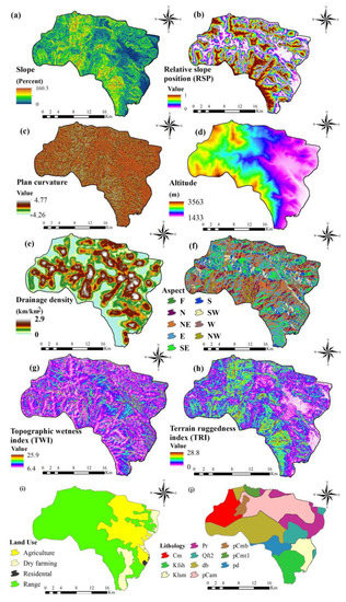 Maps showing the 10 groundwater conditioning factors considered in groundwater mapping in Piranshahr Watershed, Iran. (a) Slope, (b) relative slope position (RSP), (c) plan curvature, (d) altitude, (e) drainage density, (f) aspect, (g) topographic wetness index (TWI), (h) terrain ruggedness index (TRI), (i) land use, and (j) lithology.