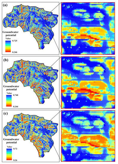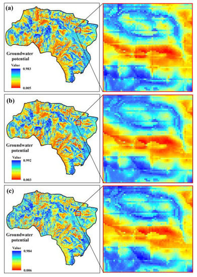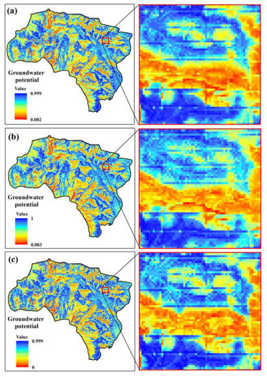 Groundwater potential maps produced by RF and three sample datasets (a–c).