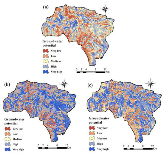 The groundwater potential maps created by sample dataset 3 (because of higher accuracy in validation step) and the GARP (Figure 5c), QUEST (Figure 6c), and RF (Figure 7c) models were then imported into ArcGIS 10.3 software and, using the quantile classification scheme [19,71], categorized into five different classes (very low, low, moderate, high, and very high potential) (Figure 8).