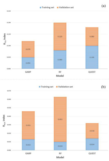 Model robustness results according to the two different evaluation criteria are presented in Figure 9. There were only slight variations in these results following changes in the training and validation samples. Therefore, it can be concluded that all three models were stable and robust in both the training and validation steps. However, as can be seen in Figure 9a, the stability of GARP (RTSS = 0.070) was slightly better than that of QUEST (RTSS = 0.080) and RF (RTSS = 0.120). As shown in Figure 9b, QUEST (RAUC ≥ 0.018) displayed high stability and robustness, while GARP (RAUC = 0.033) and RF (RAUC = 0.053) showed slight asymmetry in their results. In terms of both RTSS and RAUC, RF showed lower stability than the other models.