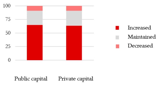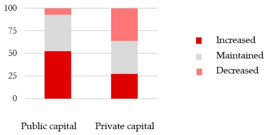 As explained above, the questionnaire was sent to all water utilities in Portugal (287 in 2014), of which 167 replied. In face of a lack of quantitative information providing a clear picture of the magnitude of the disconnections being reported, the questionnaire aimed at collecting information regarding the perceptions of those working in the front-office of water utilities. For this effect, the respondents were specifically asked: ‘How do you assess the evolution of the monthly average number of water disconnection notifications in 2014, when compared to the period before 2011?’ and ‘In comparison with the period before 2011, how would you assess the evolution of the monthly average number of water disconnections?’ They were asked to mark one of the provided possible answers: increased, maintained or decreased, and to consider their area of service. The answers were then examined comparing public and private capital water utilities, based on the idea that private capital utilities would be more market-oriented than public capital ones and therefore the results could be significantly different. The results showed that the majority of respondents (65% public and 64% private) had the opinion that the number of water disconnection notifications had increased between 2011 and 2014 (Figure 1), but that the number of actual water disconnections in the same period had not increased as much (53% public and 27% private, see Figure 2).