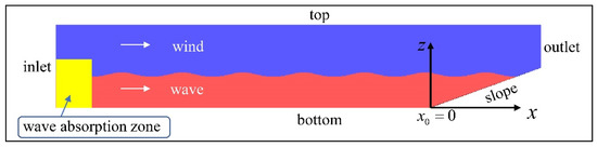 In accordance with the experimental setup in Figure 1, the main aspects of the experimental model were reproduced by setting the relevant numerical boundary conditions. According to Figure 2, the wave making and wind speed conditions were set at the inlet. Meanwhile, in an attempt to weaken the effect of wave reflection, the autonomous wave absorption boundary, with the length of the wave absorption zone set to 3 m to satisfy the parameter configuration at the request of at least one wavelength, was adopted at the inlet. Boundary conditions for other faces were: A slip wall condition at the top boundary, the no-slip wall conditions at the bottom and slope boundary, as well as the pressure outflow condition at the outlet. As for turbulent eddy viscosity, all boundary conditions were zero gradient. Additionally, a two-dimensional cartesian coordinate system was defined as indicated in Figure 2, where the coordinate origin was set at the slope foot and the positive direction of axis and represent the horizontal direction of wave propagation and the vertical upward of the flume, respectively.