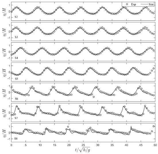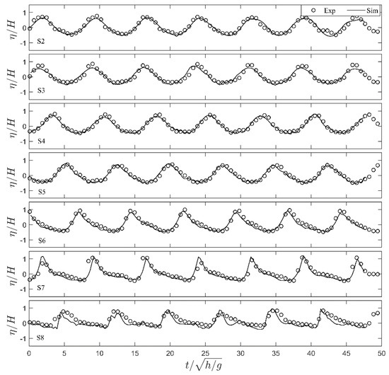 The comparison shows good agreement with the average root mean square error (RMSE) below 0.6 between the measured and computed time series of free surface elevations at the seven measured locations (S2-S8) with and without wind, as given in Figure 3 and Figure 4, respectively. At the offshore locations (S2-S4), the wave surface was symmetrical with a relatively stable wave height. When the wave propagated from S5 to S7, it became rapidly steeper and close to breaking due to the shoaling effect. After that the wave breaking occurred at a location between S7 and S8, with a sharp decrease of the maximum free surface elevation at S8.
