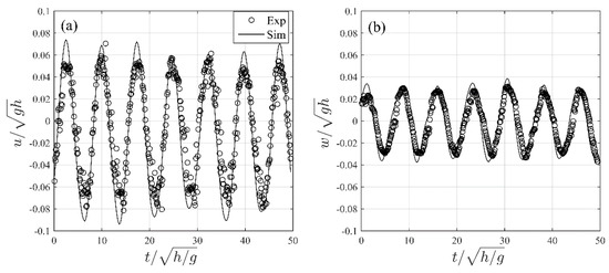 Time series of horizontal (a) and vertical (b) velocities in the absence of wind at a depth of 0.2 m. The results are shown for case W0H07.