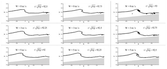 Variation of free surface in the breaking processes. The results are shown for cases W0H07 (first row), W3H07 (second row), and W5H07 (third row), respectively.