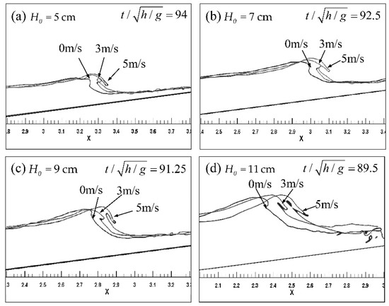 The similarity shared by different cases makes it a feasible practice to focus on typical cases here. As a result, we merely present the instantaneous snapshots of wave surface during wave breaking processes in the typical cases of W0H07~W5H07, as indicated in Figure 7, in which three moments are defined separately: Initial breaking, breaking, and overturning jet initiation. The figures indicate that the breaker type was almost unchanged among the three cases, yet there exists some differences, as reflected in the wave breaking ahead of time with the increase of wind speed. On the other hand, taking the initial breaking time in the absence of wind as a reference, we supplemented the compared results of all cases as evident in Figure 8. As an example, Figure 8a indicates that although waves with a wind speed of 3 m/s and 5 m/s were already broken at , it is just the beginning of initial breaking in the windless case. Such features are apparently also included in other cases (Figure 8b–d) and not repeated here. It suggests that the wave breaking location would migrate towards the offshore direction with the impact of wind, which probably caused changes of breaking height and depth, and even critical breaking conditions. This clearly addresses a fact that the role of wind on wave breaking in time is coincident with that in space throughout the breaking processes. As indicated in Figure 8a, the breaking courses approached each other and even overlapped for different wind speeds. It is especially true in the case of a smaller incident wave height. As the incident wave height increased, this behavior tended to disappear and the spatial distribution of each course seemed to disperse, as shown in Figure 8b–d. It can be inferred that the incident wave height was one of the main factors affecting the dispersion degree of wave breaking locations under the same wind speed coverage constraint.